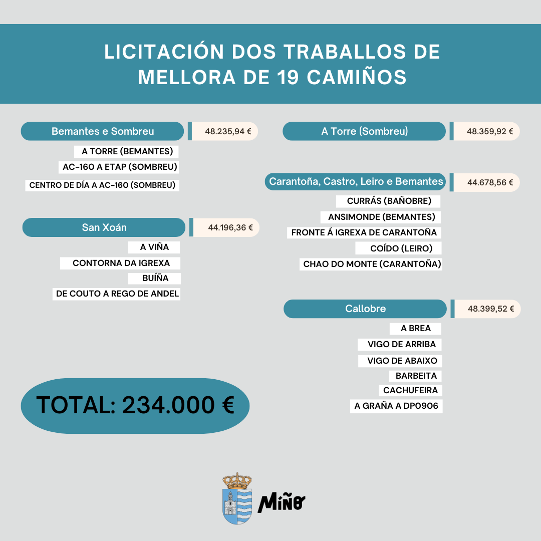 Os camiños que se renovarán son: dous na Torre (Sombreu); da AC-160 á ETAP; do Centro de Día á AC-160; na Viña, detrás da igrexa de San Xoán; na contorna da igrexa de San Xoán; de Couto a Rego de Andel (DP-4802); en Buíña; fronte á igrexa de Carantoña; en Currás (Castro); de entre camiños a Chao do Monte (Carantoña); en Coído (Leiro); en Ansimonde (Bemantes); e na parroquia de Callobre na Brea, Barbeita, Vigo de Arriba, Vigo de Abaixo (praza), Cachufeira e A Graña (desde casa rural a DP-0906).