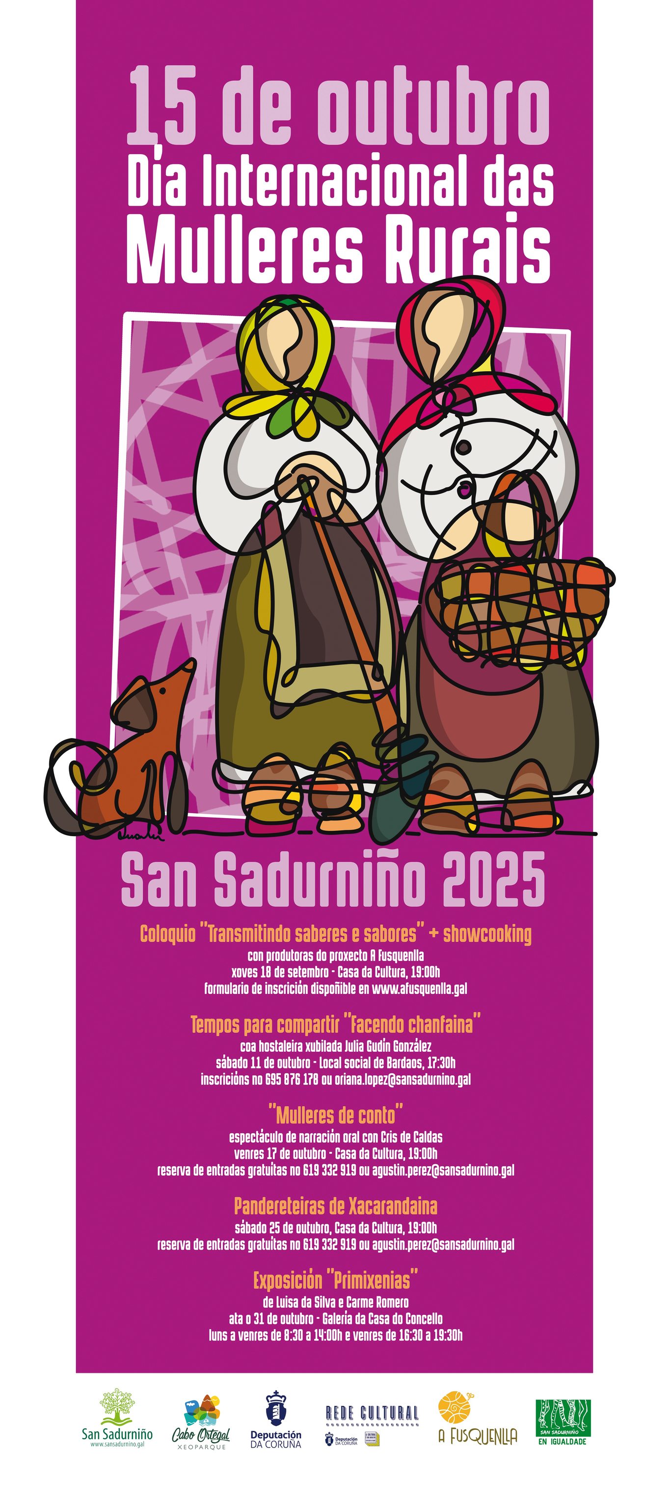 Uns días despois, o venres 17 de outubro, Igualdade ofrecerá ás 19:00h na Casa da Cultura o espectáculo “Mulleres de conto”. A narradora Cris de Caldas traeranos relatos de mulleres que non sempre levaron unha vida de conto, pero que por iso mesmo merecen ser lembradas. Faremos unha viaxe a través de historias recompiladas que mesturan a tradición oral coa realidade, ás veces dura, pero narrada cun humor (sempre necesario) nun acto de lembranza, un berro de xustiza e unha celebración da resiliencia das mulleres do rural. O espectáculo é con entrada libre e chega a San Sadurniño grazas á Rede Cultural da Deputación da Coruña.