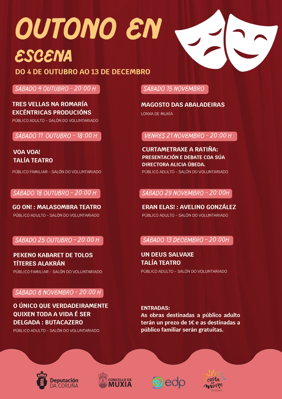 O Concello de Muxía pon en marcha este outono o ciclo de teatro “Outono en Escena”, unha programación que se desenvolverá ao longo de toda a estación e que traerá á vila compañías de primeiro nivel do panorama galego. A iniciativa conta co apoio da Rede Cultural da Deputación da Coruña, que facilita a chegada de propostas escénicas de gran calidade á nosa contorna.