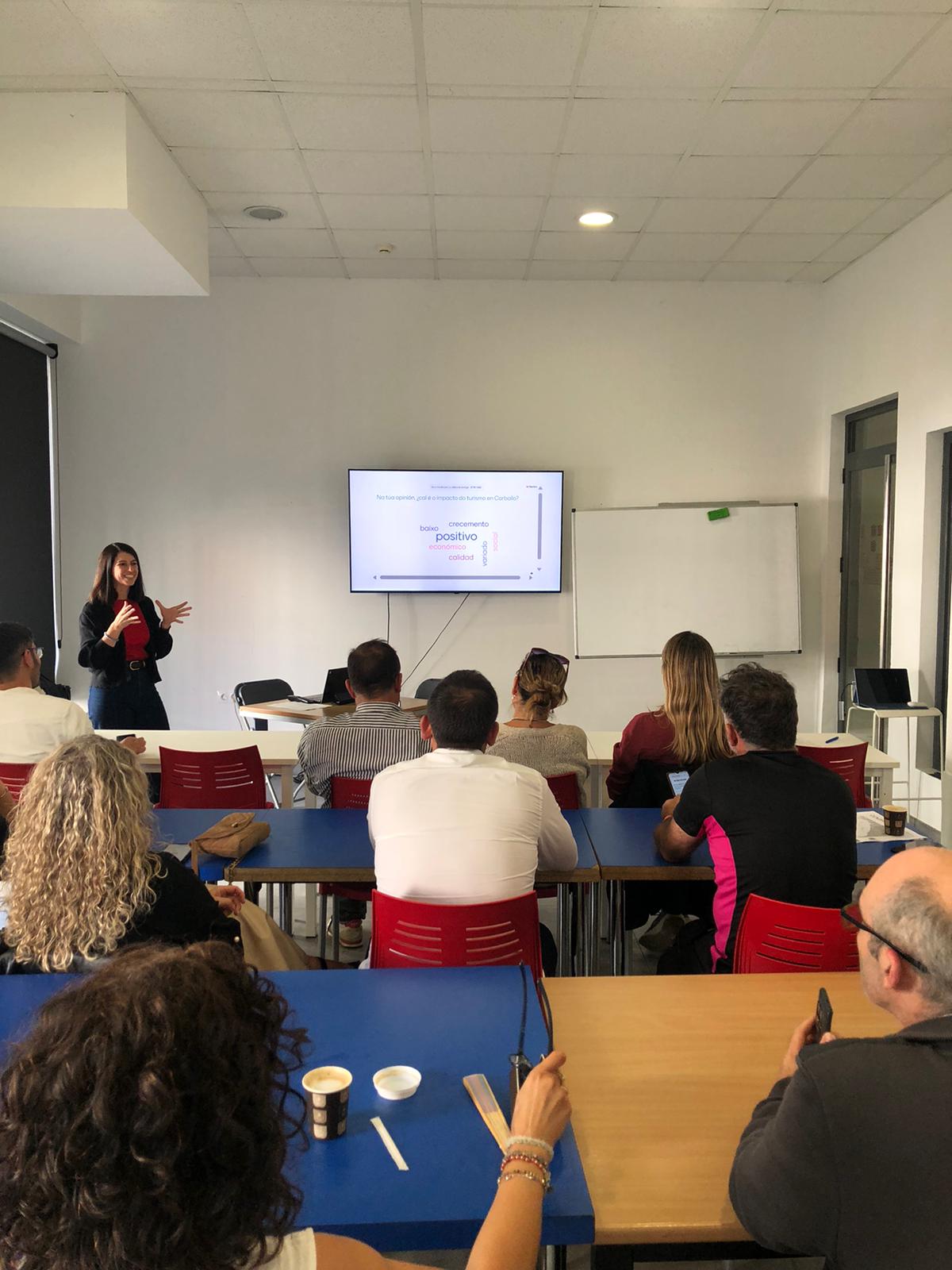 A presentación do programa C4S xerou moita expectación e encheu a sala de formación do mercado municipal. Nesta primeira sesión falouse sobre a relevancia que ten actualmente a sostibilidade no desenvolvemento turístico, e como exemplo contamos co testemuño de Alejandro Sánchez, da empresa Abeiro da Loba, que compartiu a súa experiencia de negocio e asegurou que “formar parte dun ecosistema de empresas comprometidas que cumpren con certos estándares, cunha mesma carta de presentación, xera destino”.