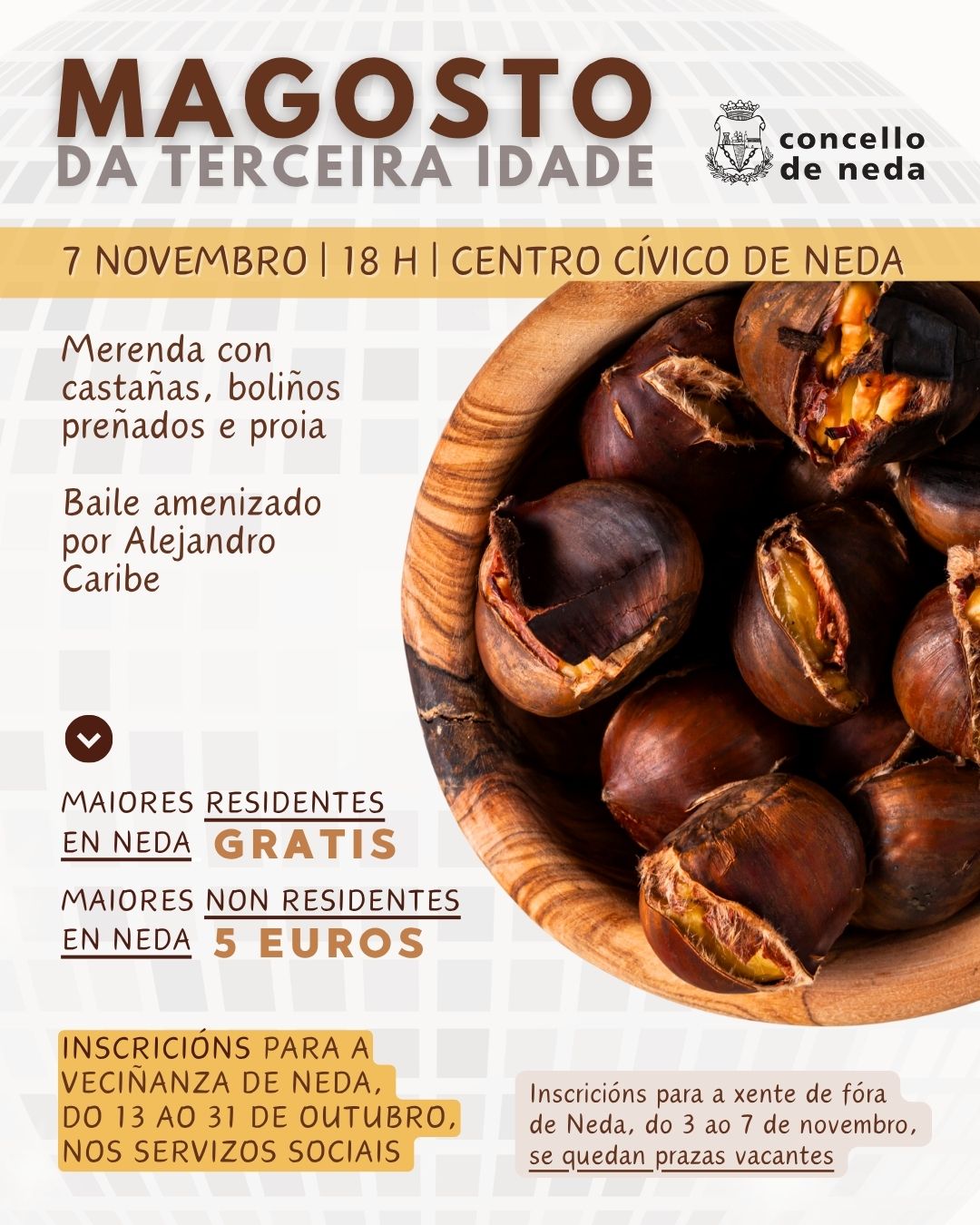 O Concello de Neda abrirá o vindeiro luns o prazo para que a veciñanza da localidade se inscriba no Magosto da terceira idade. Trátase dunha proposta de ocio, pensada para que as persoas maiores desfruten desta festa tradicional. A actividade terá lugar o venres 7 de novembro, a partir das 18 horas.