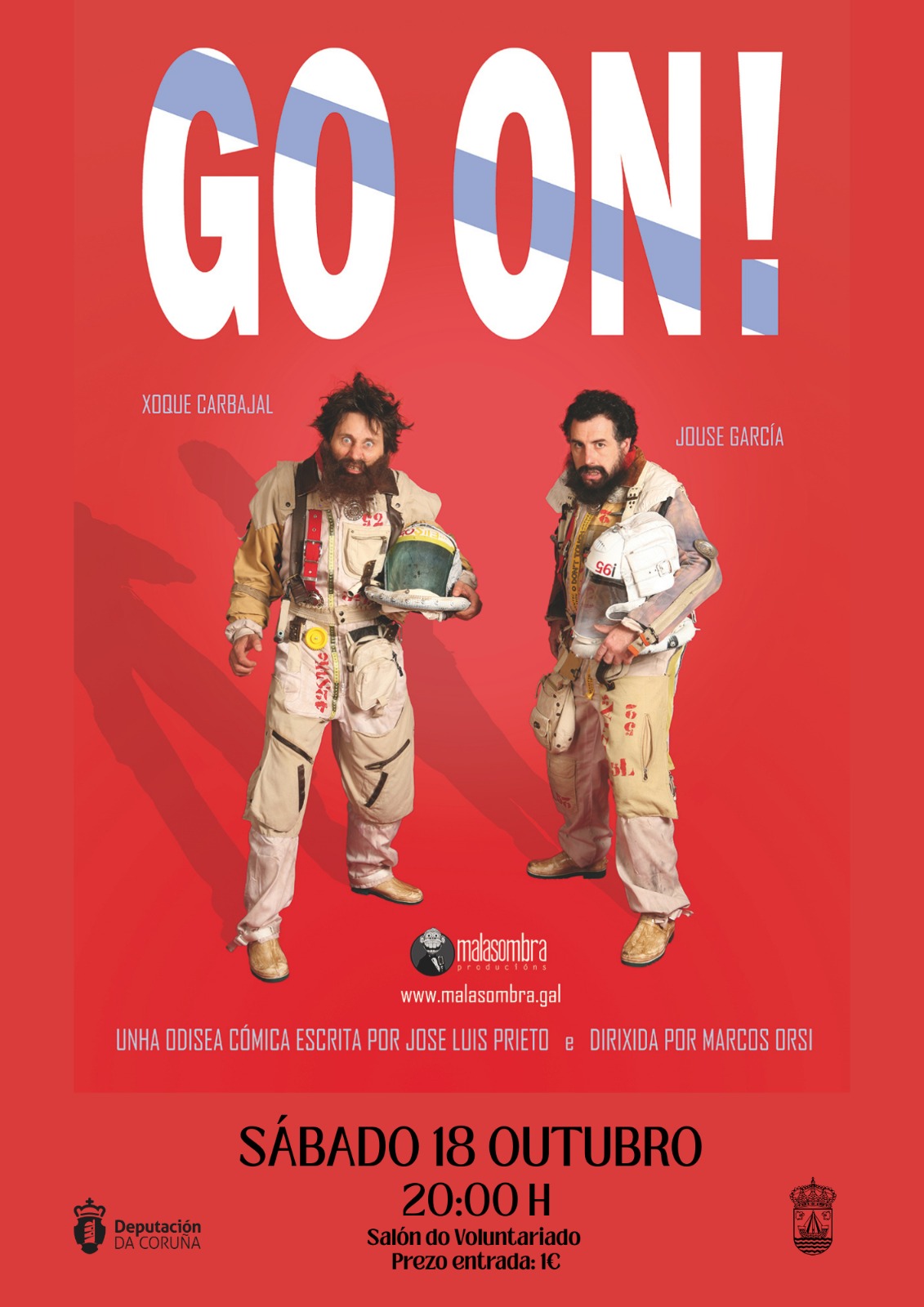 O sábado 18 de outubro, ás 20:00 horas, no Salón do Voluntariado, representarase a comedia GO ON!, unha divertida e irreverente aventura interpretada por Josue García e Xoque Carbajal, con texto de Jose Luis Prieto e dirección de Marcos Orsi.