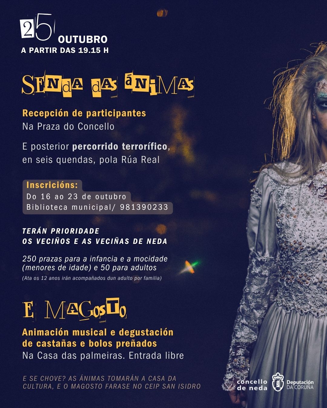 Neda prepárase para vivir ao grande a celebración do samaín e tamén o seu tradicional magosto. O núcleo urbano centralizará o sábado 25 de outubro a programación festiva, na que a terrorífica “Senda das ánimas”, chea de sustos, será a aposta central da xornada. En caso de chuvia, este singular percorrido guiado trasladarase aos distintos andares da Casa da Cultura.