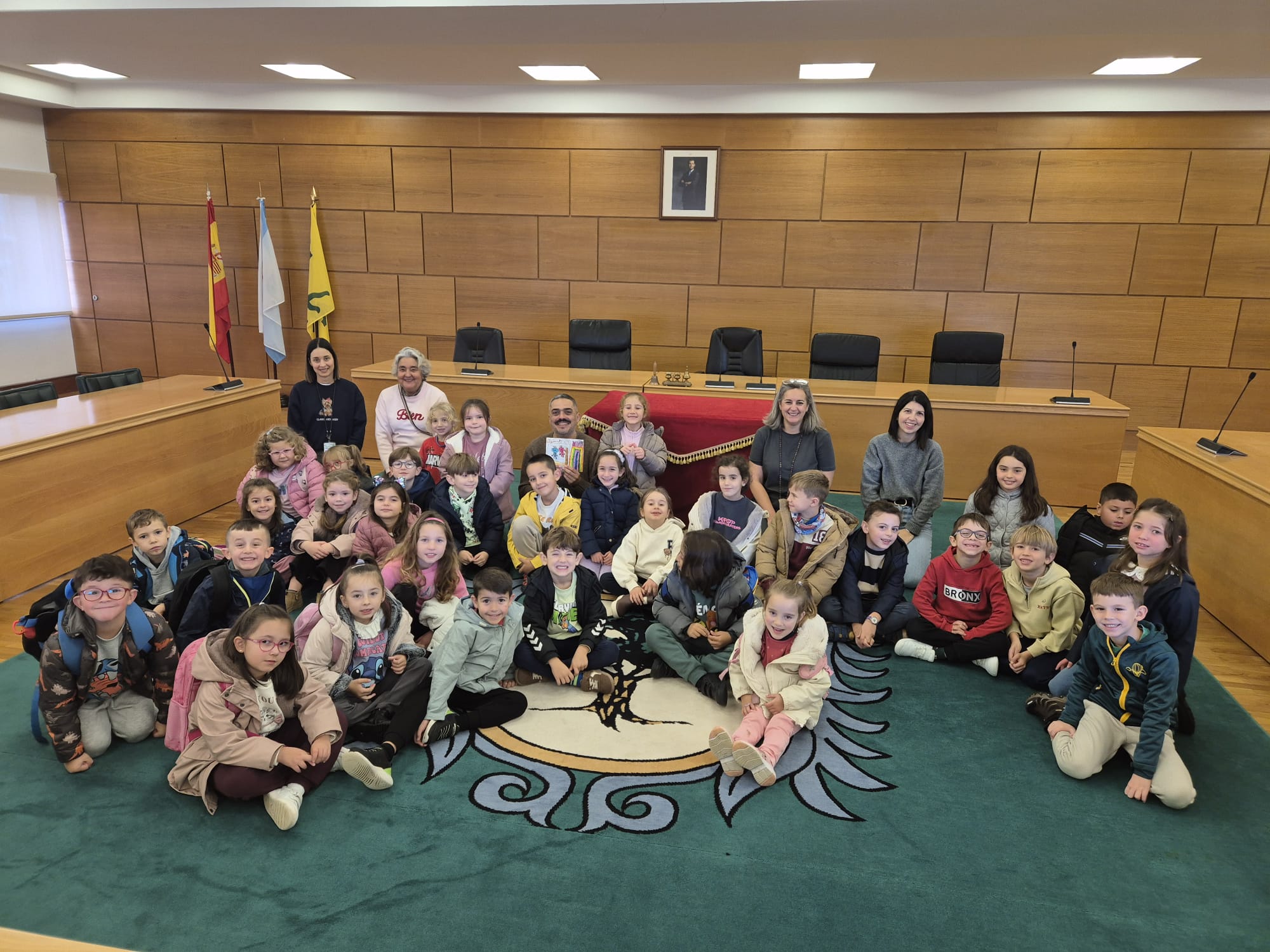 Daniel Pérez recibiu ao alumnado do CEIP Gándara-Sofán no salón de plenos acompañado pola concelleira de Cultura e Festas, Maruxa Suárez, que lles explicou que nese espazo é onde se toman as decisións importantes e que os convidou a coñecer outras dependencias da casa do concello.