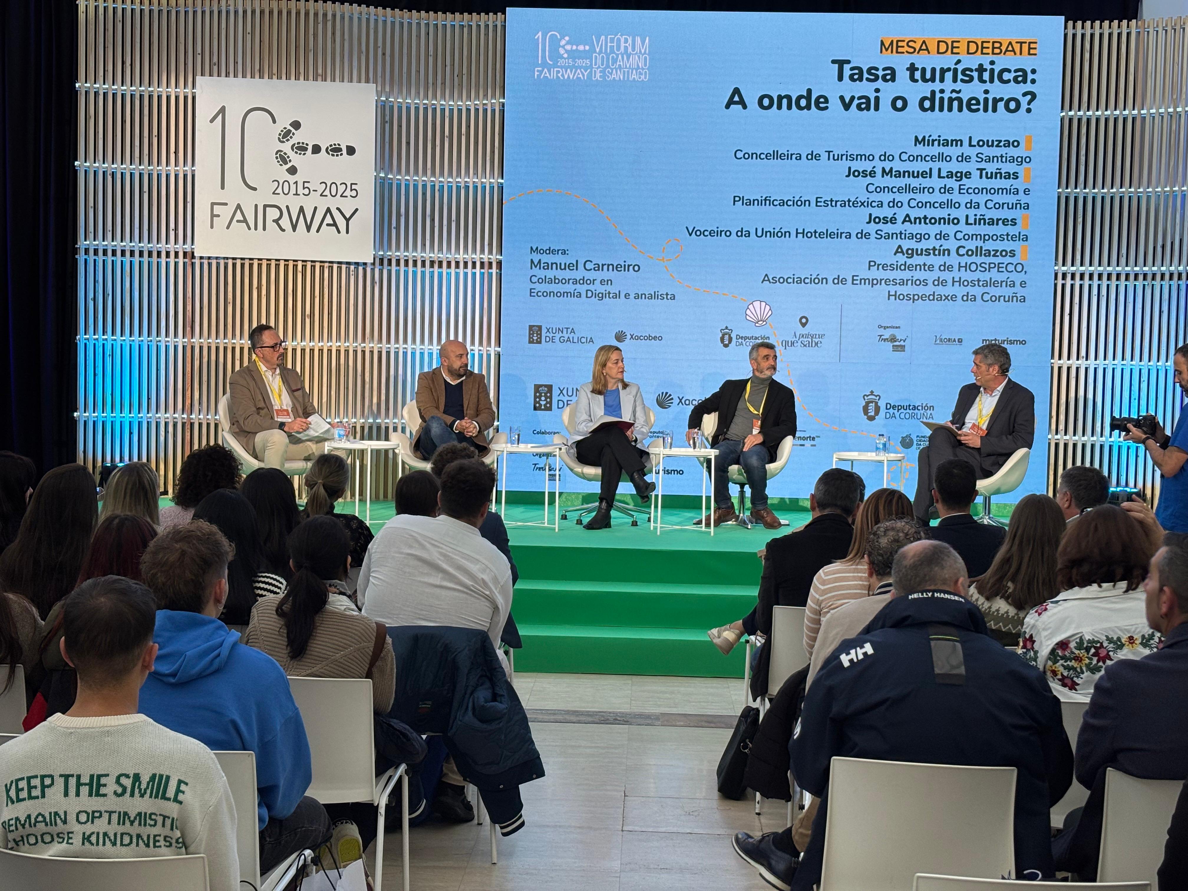 A concelleira de Turismo, Míriam Louzao, participou esta mañá na mesa redonda “Taxa turística, a onde vai o diñeiro?” no marco do Fairway, xunto ao concelleiro de Economía da Coruña, José Manuel Lage Tuñas, o representante de Unión Hotelera, José Antonio Liñares, e o presidente da Asociación de Empresarios de Hostalería da Coruña, Agustín Collazos.