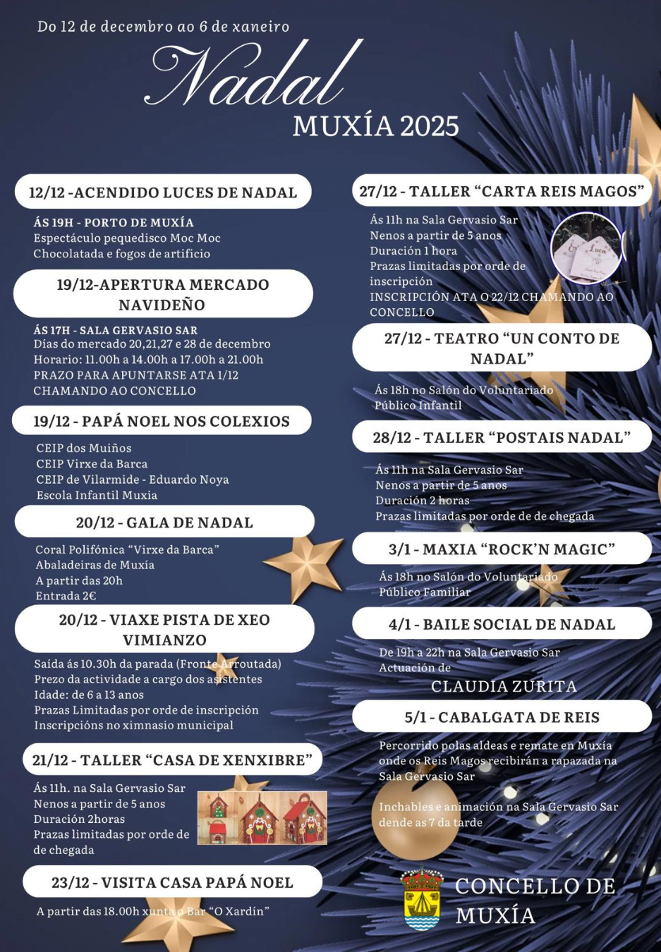 O Concello de Muxía presentou a súa programación oficial do Nadal 2025, que decorrerá entre o 12 de decembro e o 6 de xaneiro e inclúe máis dunha vintena de actividades pensadas para todos os públicos. O goberno municipal subliña tres citas principais: o acendido das luces, a apertura do Mercado Navideño, e como grande novidade, a celebración do primeiro Baile Social de Nadal.