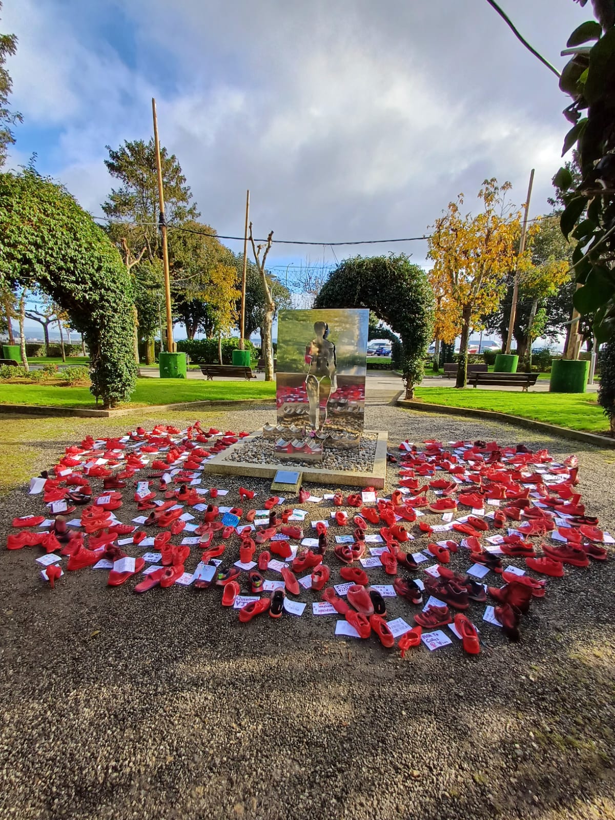‘Non ao medo a entrar na casa’, ‘xa non máis dor’ e ‘por todas as mulleres asasinadas no mundo. Contra a violencia de xénero’. Esas son, unicamente, algunhas das frases poden lerse no monumento en honor ás vítimas de violencia de xénero dos xardíns Valle-Inclán. Detrás destes traballos, que forman parte da exposición Zapatos vermellos, atópase o alumnado de primaria do CEP Plurilingüe Salustiano Rey Eiras e do CEP Plurilingüe Pilar Maestu Sierra.