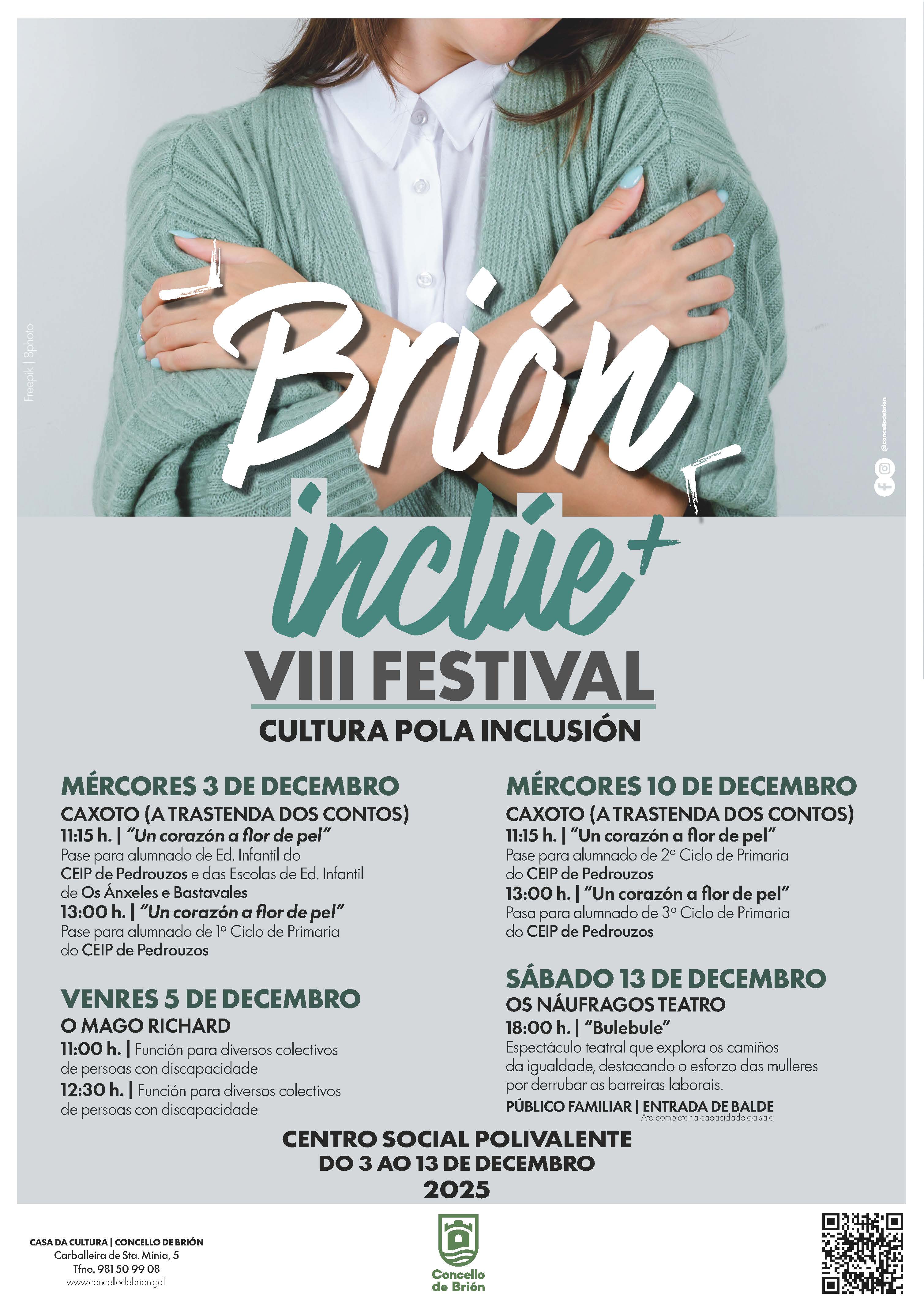 O Concello de Brión ten todo preparado para o inicio da oitava edición do festival Brión Inclúe, que do 3 ao 13 de decembro achegará unha ampla e variada programación pensada dende e para a inclusión real de persoas con discapacidade, que serán as principais protagonistas do certame tanto como creadoras e consumidoras de cultura. Un programa que arrincará mañá mércores 3 de decembro, coas dúas primeiras sesións do espectáculo “Un corazón a flor de pel”, da man de Caxoto.