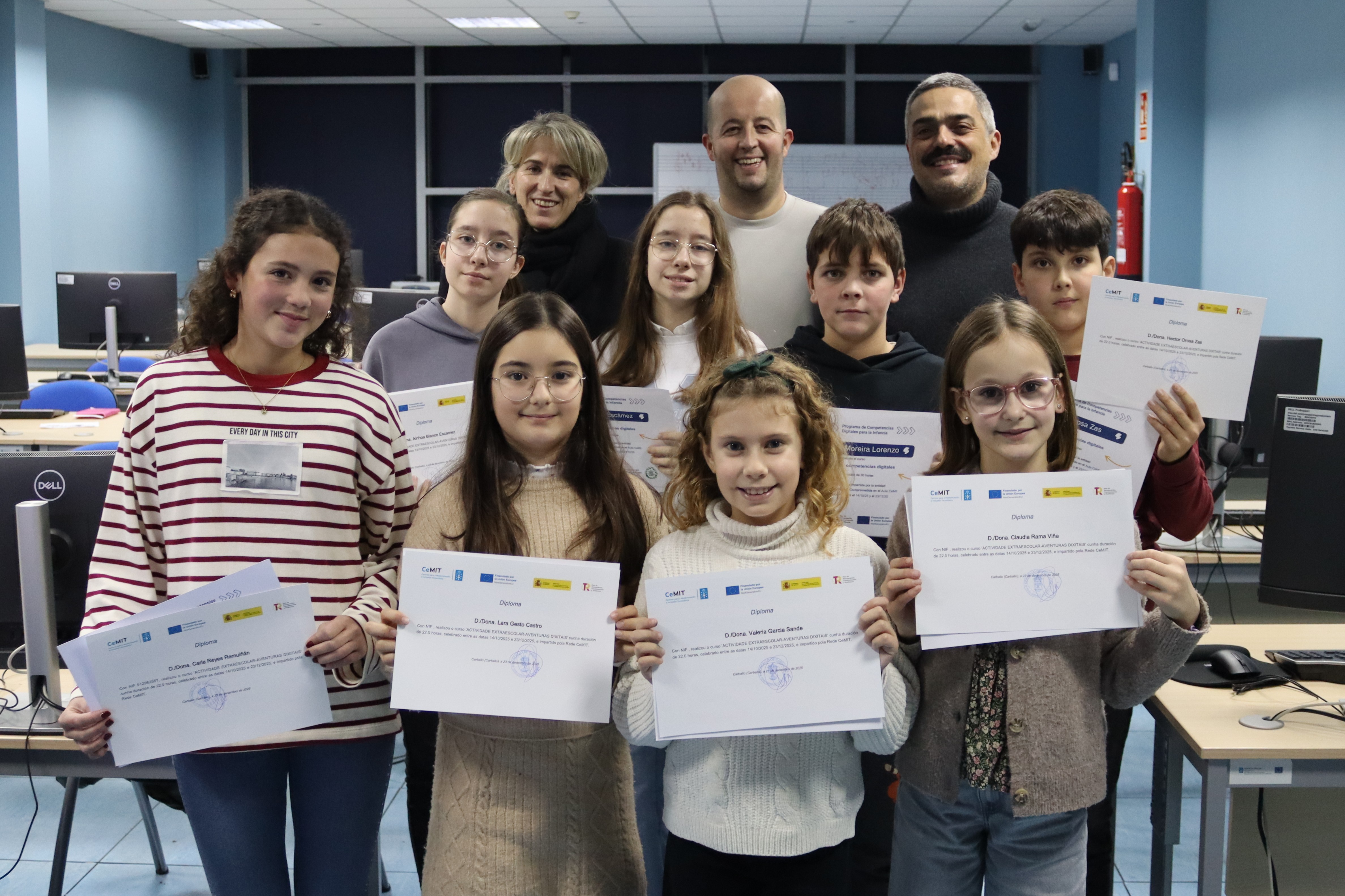 Despois de algo máis de dous meses de formación, os nenos e nenas de 9 a 13 anos que participaron no último campamento dixital organizado pola Concellaría de Innovación en colaboración coa Fundación Esplai recibiron os diplomas que certifican as competencias dixitais adquiridas. O alcalde, Daniel Pérez; o concelleiro de Innovación, Iván Andrade, e a técnica responsable da Aula CeMIT, Milagros Antelo, fixéronlles entrega dos títulos acreditativos este martes 23.