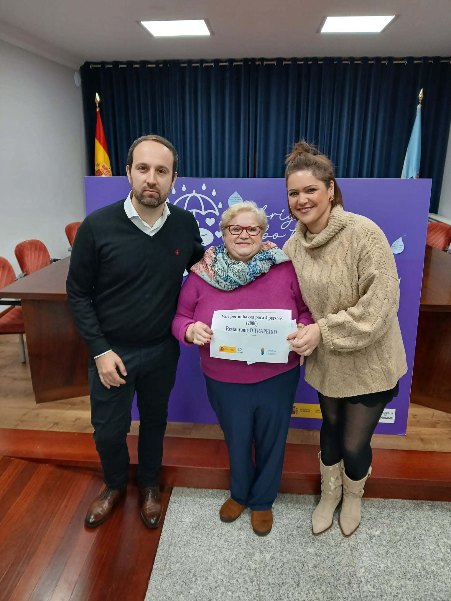 O alcalde de Lousame, Esteban Ares García, e a concelleira de Igualdade, Silvia Agrafojo, veñen de entregar a Isabel González o premio da campaña de sensibilización “Abrígate baixo o paraugas do bo trato”, organizada polo Concello de Lousame co gallo da conmemoración do 25N e financiada con cargo ao Pacto de Estado contra a Violencia de Xénero e o Ministerio de Igualdade.