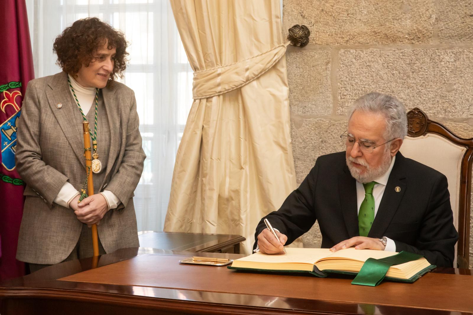 O delegado rexio, Miguel Ángel Santalices, asinou no Libro de Honra do Concello de Santiago e pronunciou unhas verbas de agradecemento no Salón Vermello. A alcaldesa da cidade, Goretti Sanmartín, deu a benvida a todos os asistentes ao Pazo de Raxoi no nome do conxunto da Corporación Municipal.
