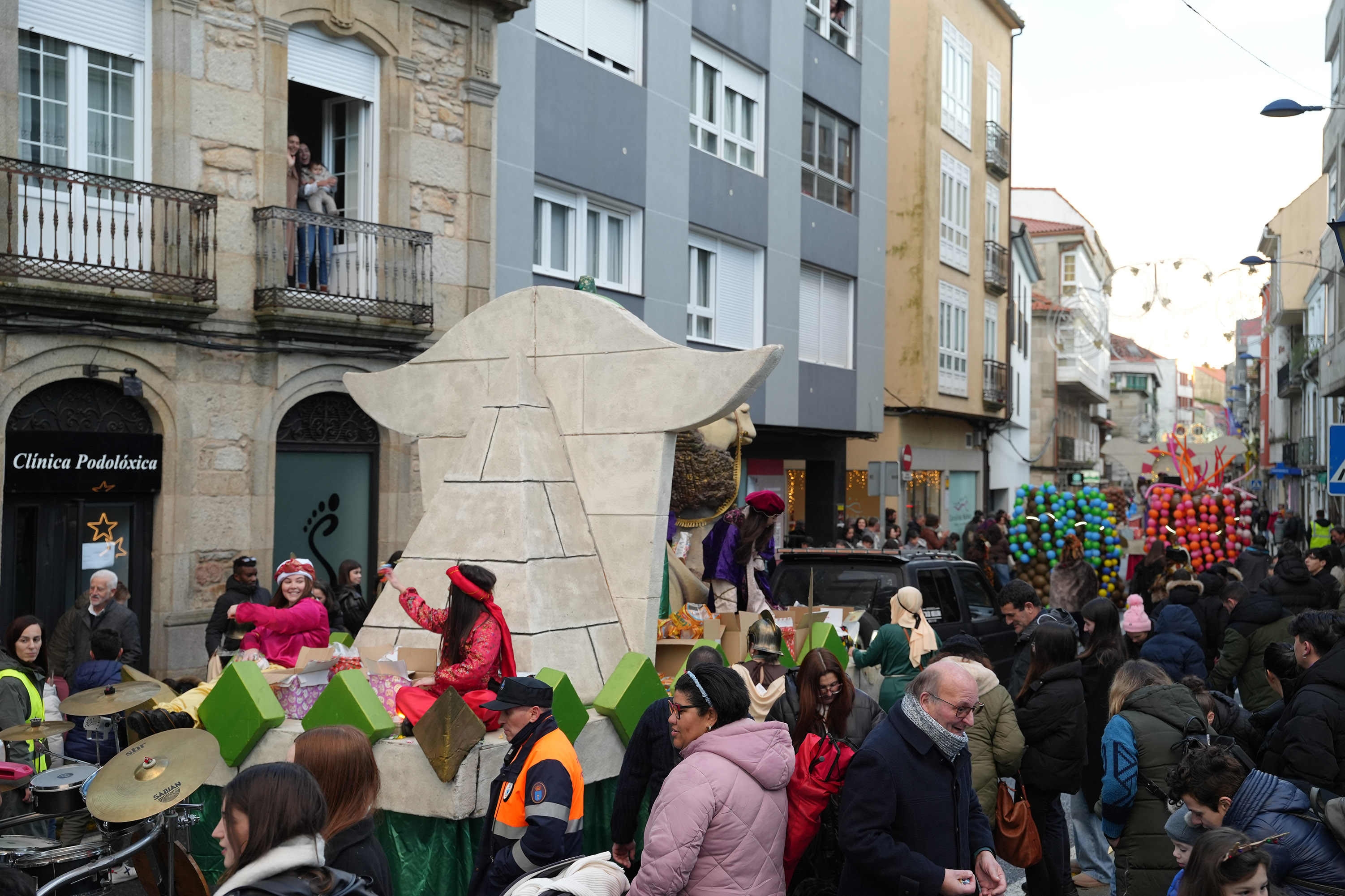 Centos e centos de persoas asistiron, esta tarde, á Cabalgata que os Reis Magos realizaron polo centro da vila. Ao son da música dos grupos Troula co séquito do carteiro real, Barafunda Animación e Fanfarria Furruxa, as Súas Maxestades de Oriente partiron desde o peirao comercial e pasaron polas rúas Díaz de Rábago, da Paz e Gasset ata chegar á liña de meta: o pavillón da rúa Venecia.