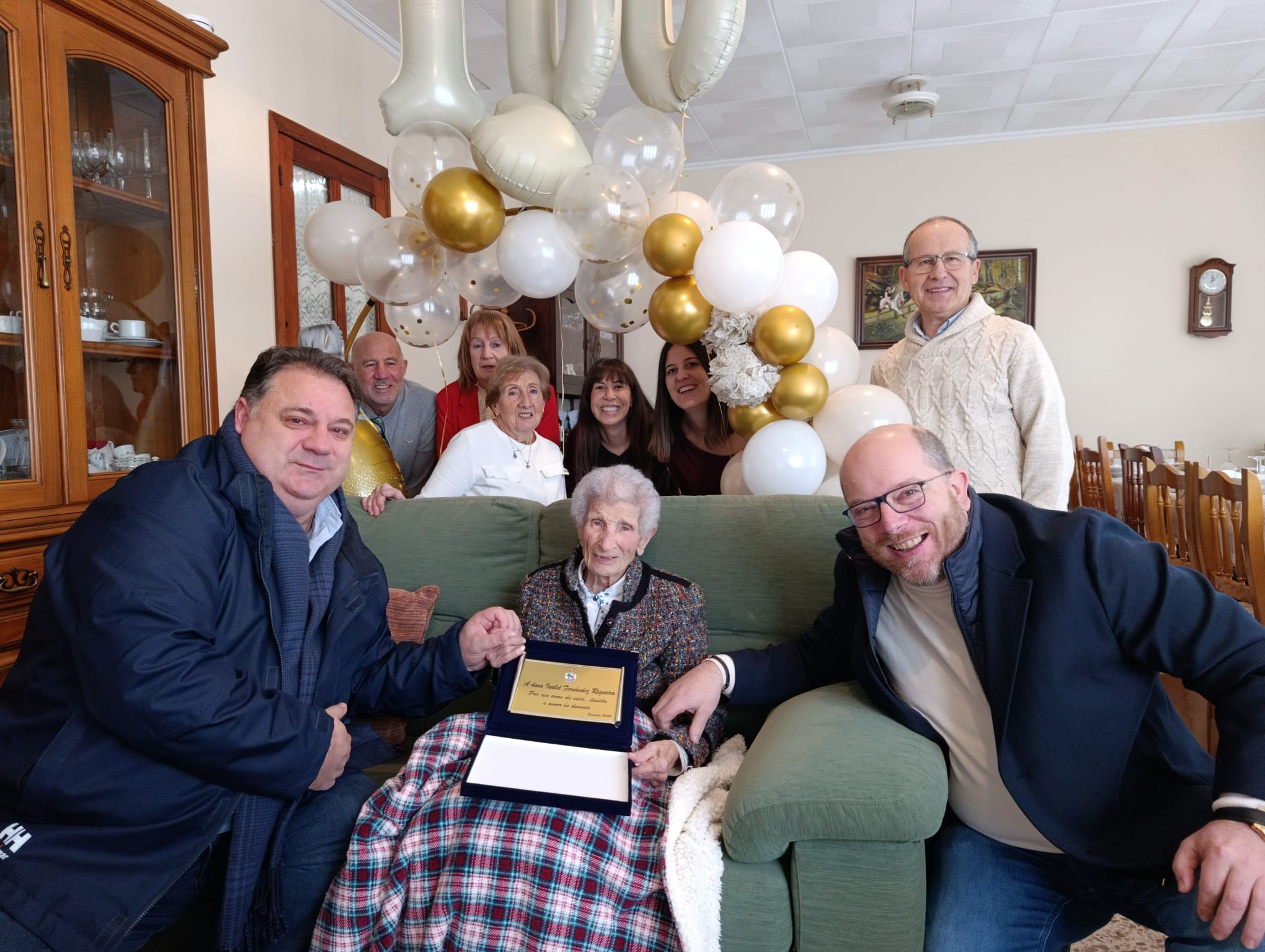 Isabel Fernández Regueira, veciña de Frades, vén de celebrar coa súa familia o seu 100 aniversario. Unha festa que tivo lugar na casa familiar na localidade de Ponte Carreira, parroquia de Gafoi, o pasado sábado 10 de xaneiro cos seus familiares máis achegados.