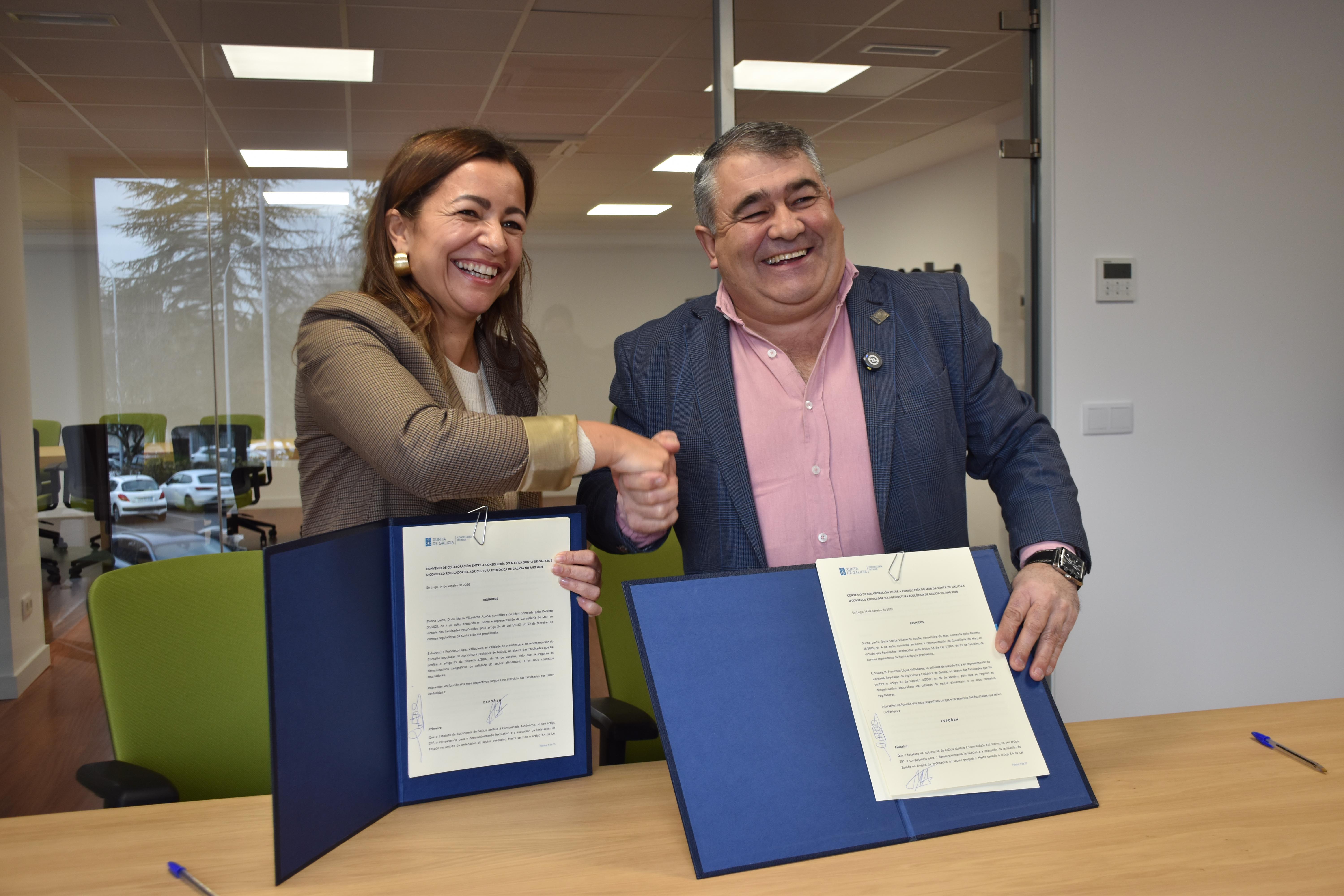 A conselleira do Mar da Xunta de Galicia, Marta Villaverde, e o presidente do Consello Regulador da Agricultura Ecolóxica de Galicia (Craega), Francisco López Valladares, reuníronse esta mañá na sede do Craega, en Lugo, para a sinatura dun novo convenio de colaboración.