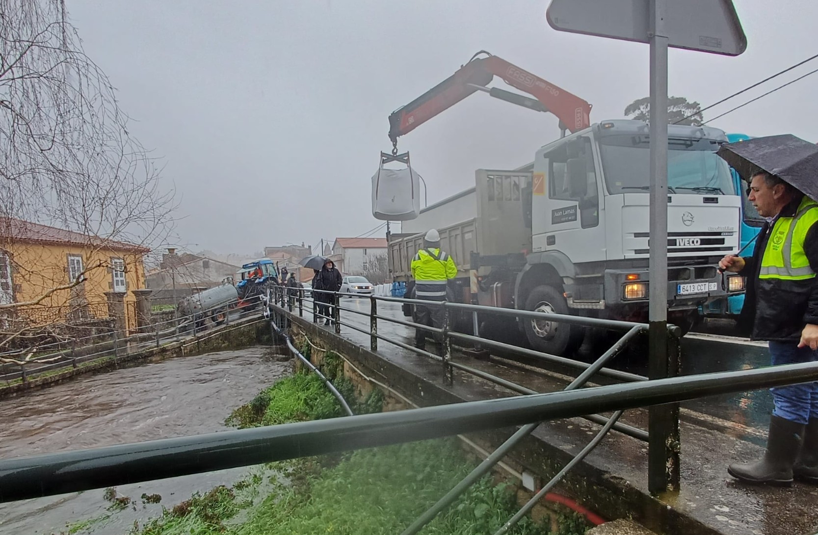 Avanzada a mañá, o Concello aprovisionábase de sacos de area e grava para colocar, en función das necesidades, barreiras na zona comprendida entre Santa María e As Augas. Ao mediodía, comezaba a instalarse a primeira.