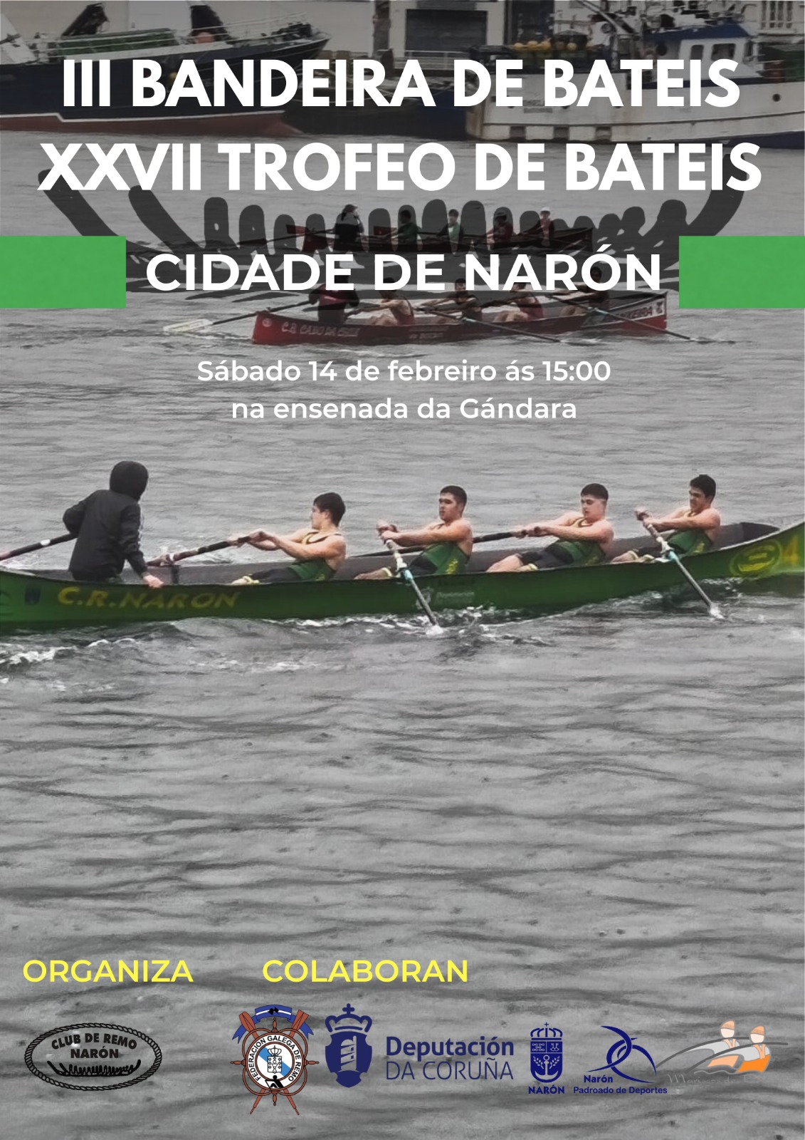 A proba está organizada polo Club de Remo Narón coa colaboración do Padroado de Deportes do Concello de Narón, a Federación Galega de Remo e a Deputación da Coruña.