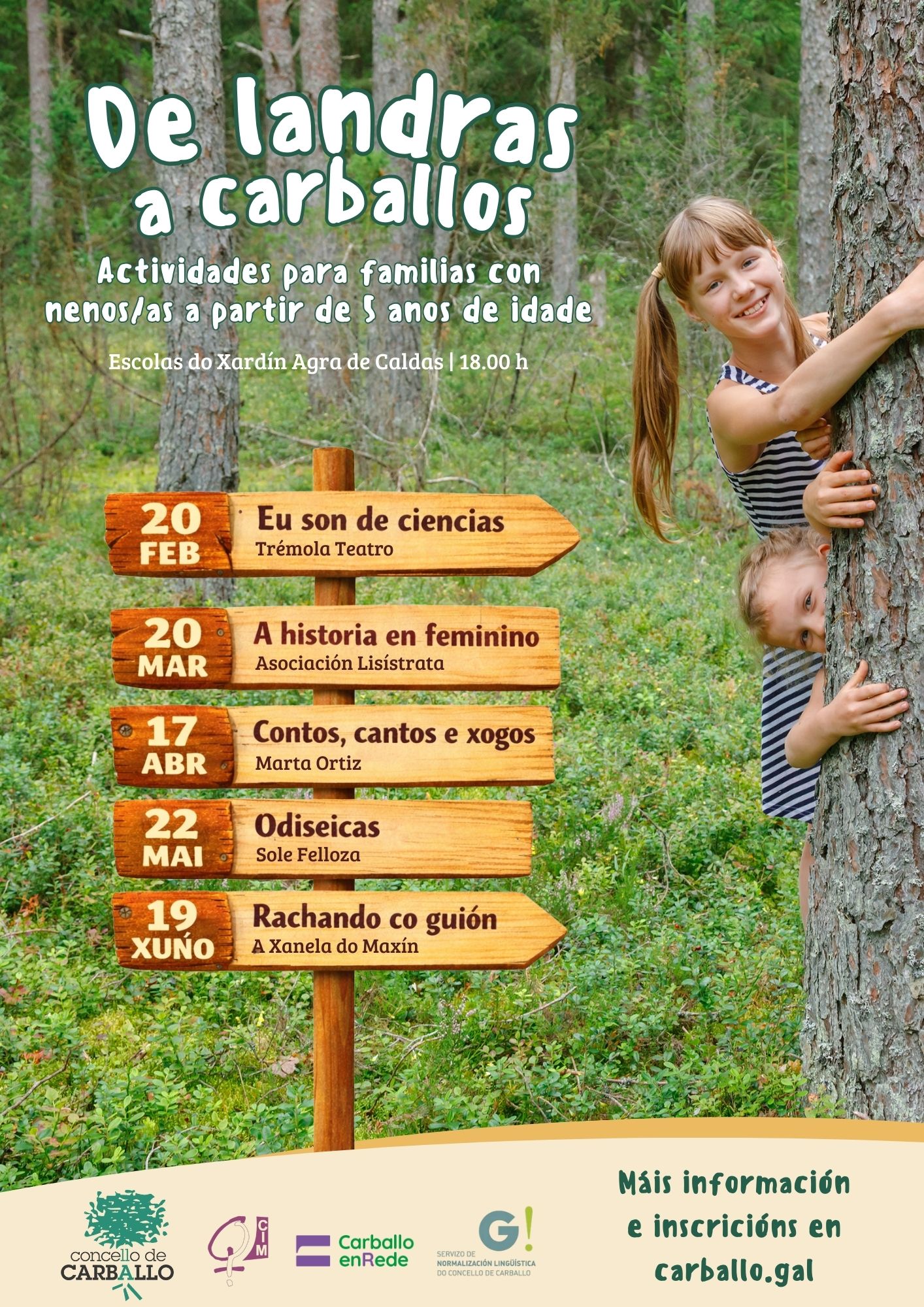 As concellarías de Igualdade e Normalización Lingüística presentan a nova edición do programa De landras a carballos, unha iniciativa pensada para reunir actividades culturais, educativas e lúdicas dirixidas ás familias e á infancia na fase entre os 5 e os 11 anos. O ciclo estenderase de febreiro a xuño, e desenvolverase nas Escolas do Xardín Agra de Caldas, sempre ás 18.00 horas.