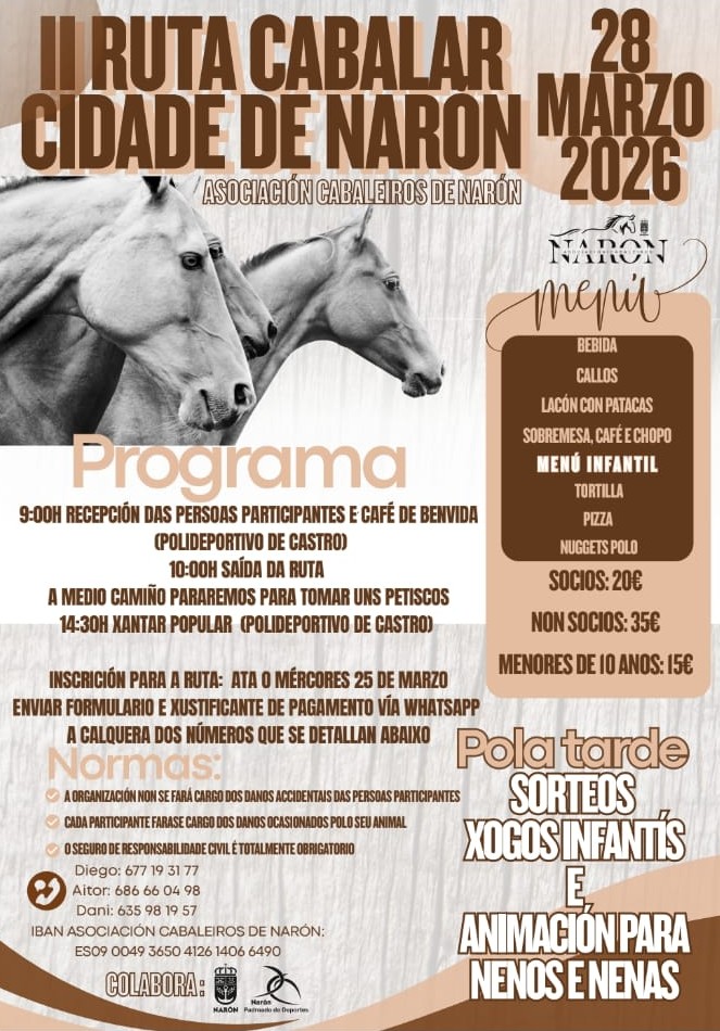 A Asociación Cabaleiros de Narón organiza o sábado 28 de marzo a II Ruta Cabalar Cidade de Narón, unha cita dirixida ás persoas afeccionadas ao mundo ecuestre que conta coa colaboración do Concello e do Padroado de Deportes. As inscricións xa están abertas e poderán formalizarse ata o mércores 25 de marzo.
