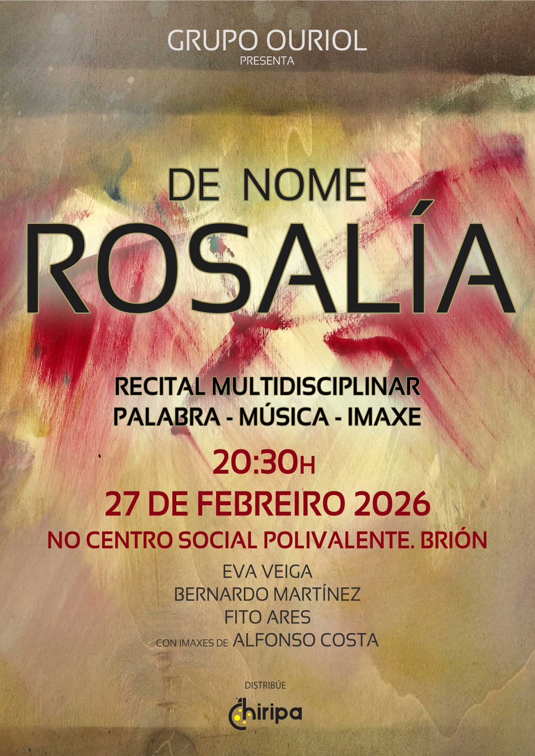 O centro social polivalente de Brión acollerá mañá venres 27 de febreiro, ás 20:30 horas, o espectáculo “De nome Rosalía”, do Grupo Ouriol. Trátase dun recital multidisciplinar que mestura palabra, música e imaxe da man dos artistas Eva Veiga, Bernardo Martínez, Fito Ares e Alfonso Costa sobre poesías de Rosalía de Castro, especialmente dos libros Cantares Gallegos e Follas Novas. Entrada libre e de balde ata completar aforo.
