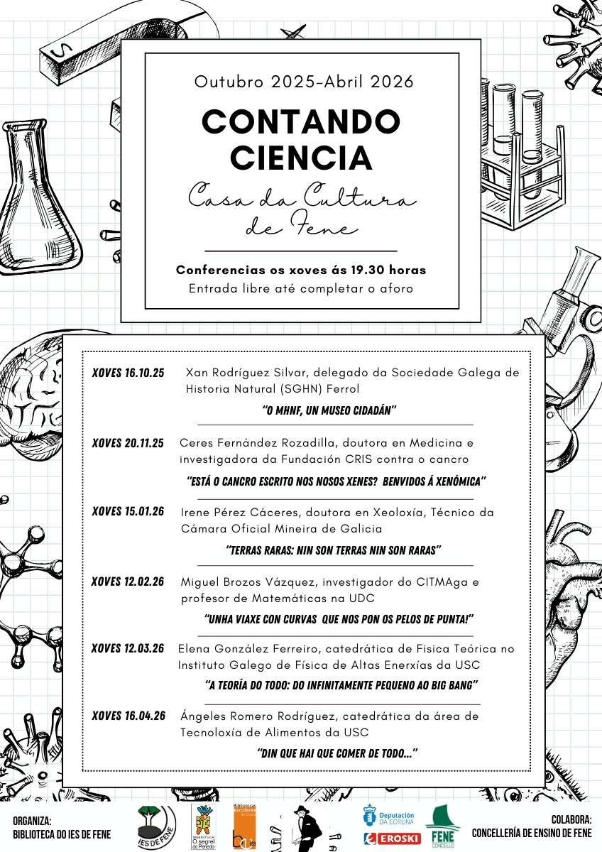 A catedrática de Física Teórica do Instituto Galego de Física de Altas Enerxías da USC, Elena González Ferreiro, falará esta semana en Fene sobre a constitución da materia, sobre teorías para comprender as interaccións fundamentais da materia e sobre como se están tentando recrear os instantes do Big Bang nos aceleradores actuais. A conferencia, enmarcada no ciclo Contando Ciencia, será este xoves, 12 de marzo, ás 19.30 horas, no salón de actos da Casa da Cultura con entrada libre e gratuíta. Ciclo organizado pola Biblioteca O Segrel do Penedo do IES de Fene coa colaboración da Concellería de Ensino de Fene e baixo a coordinación da mestra Violeta Miraz Seco.