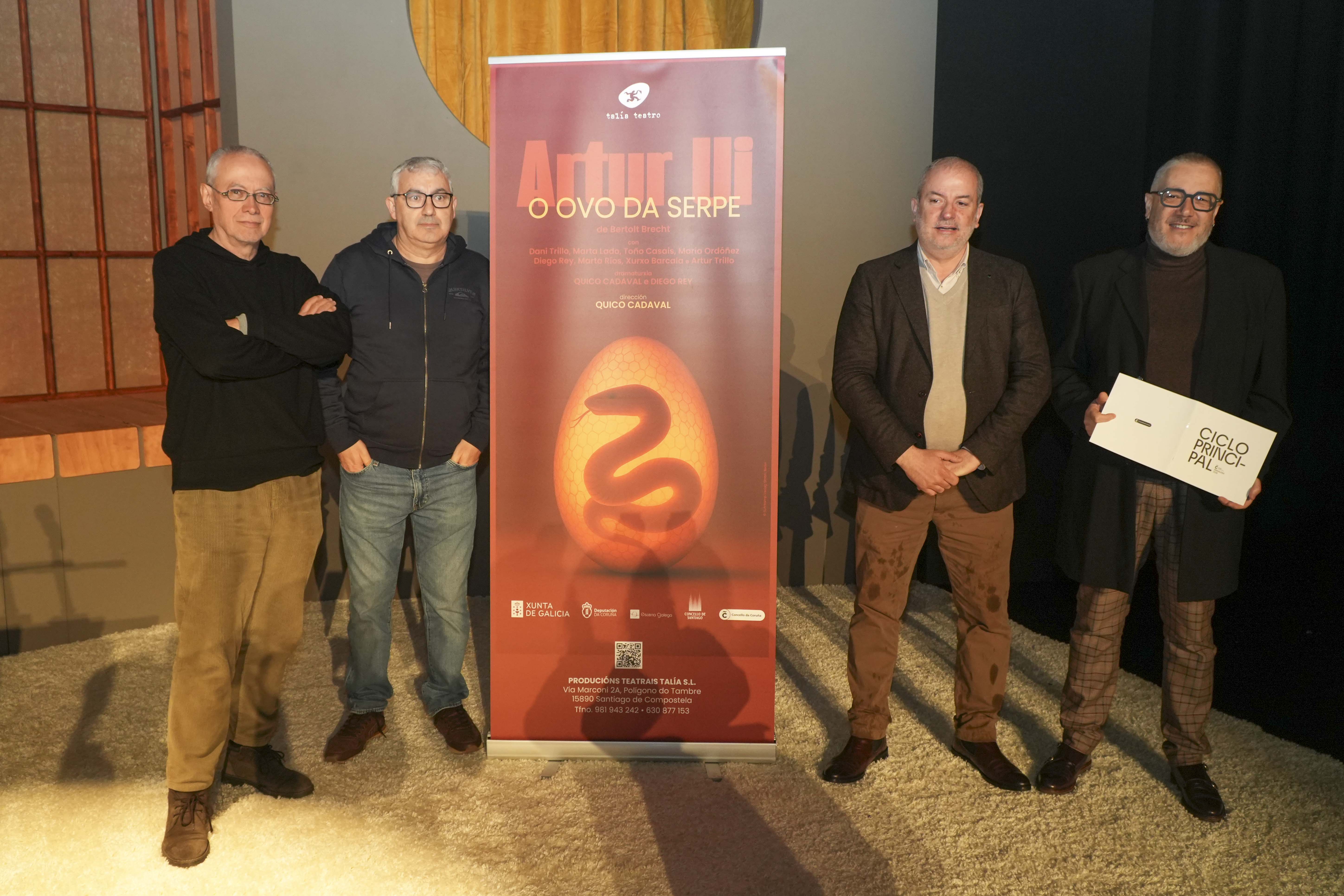 O Teatro Colón da Coruña acolleu este mércores a presentación da nova obra de Talía Teatro, ‘Artur Ui, o ovo da serpe’, unha adaptación de ‘A resistible ascensión de Artur Ui’, de Bertolt Brecht. O concelleiro de Cultura e Turismo, Gonzalo Castro, estivo presente no acto, acompañado polo director do teatro, Paulo Rodríguez. Tamén participaron Jacobo Sutil, director do AGADIC, Artur Trillo, director de Talía Teatro e actor, e Quico Cadaval, director do espectáculo.