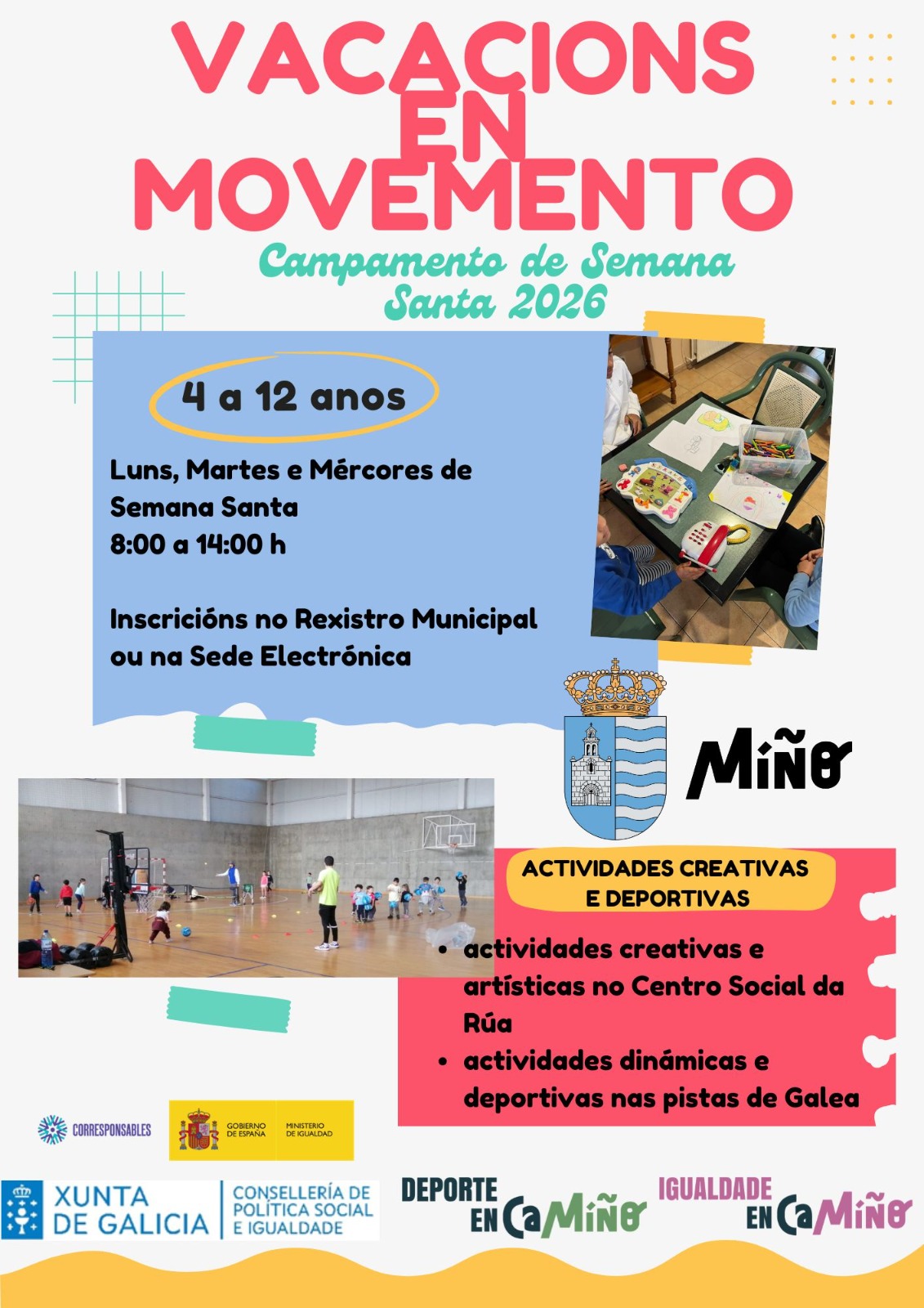 O Concello de Miño poñerá en marcha un campamento de conciliación durante as próximas vacacións escolares de Semana Santa. Esta iniciativa ten como obxectivo principal facilitar o equilibrio entre a vida laboral e familiar dos veciños e veciñas durante os días non lectivos, e levará a cabo os días 30 e 31 de marzo, e o 1 de abril.