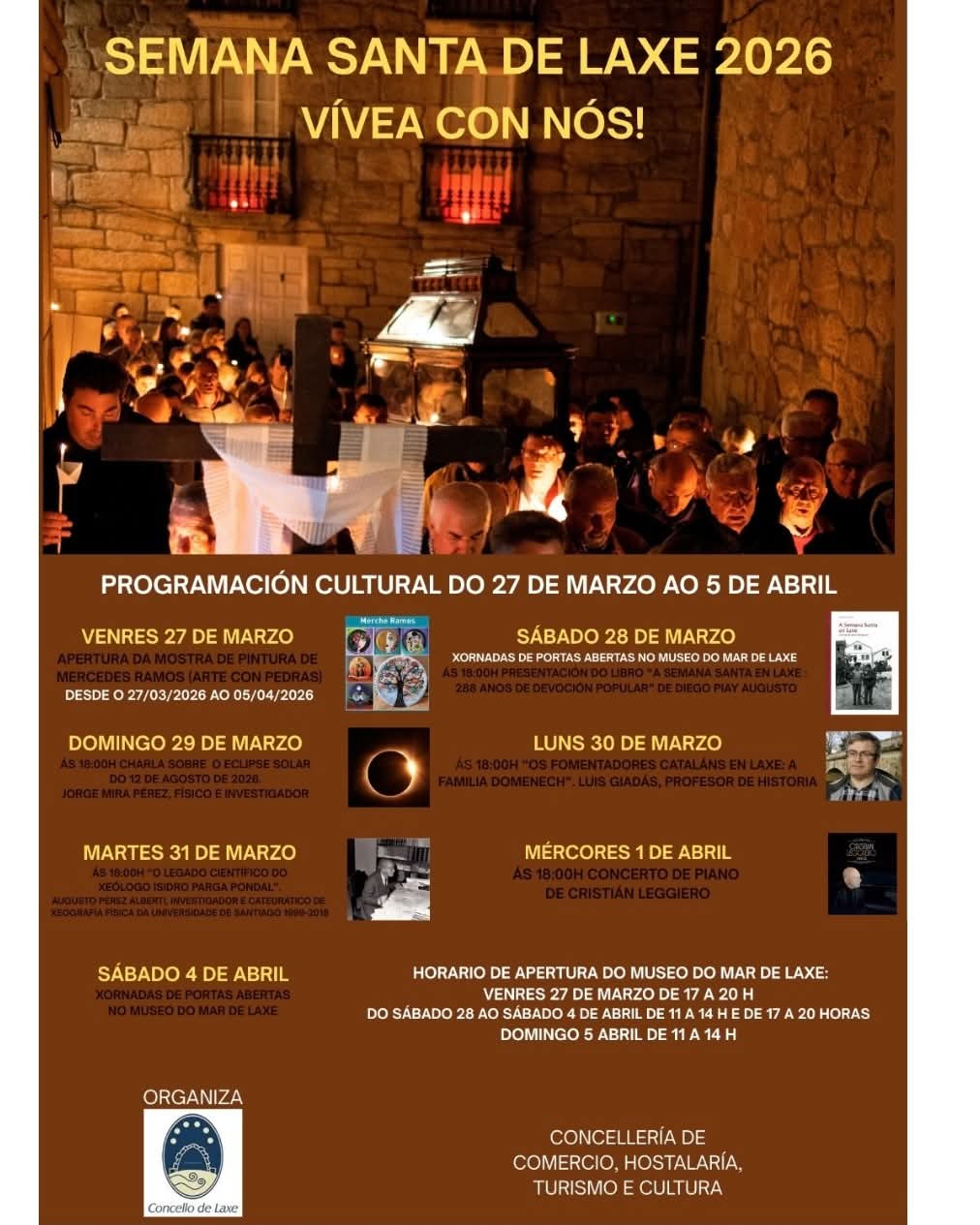 Baixo o lema “Semana Santa de Laxe 2026, vívea con nós!”, o Goberno local presenta unha proposta diversa pensada para complementar estas datas tan sinaladas cunha oferta cultural de calidade, que combina exposicións, charlas, presentacións, concertos e xornadas de portas abertas no Museo do Mar.