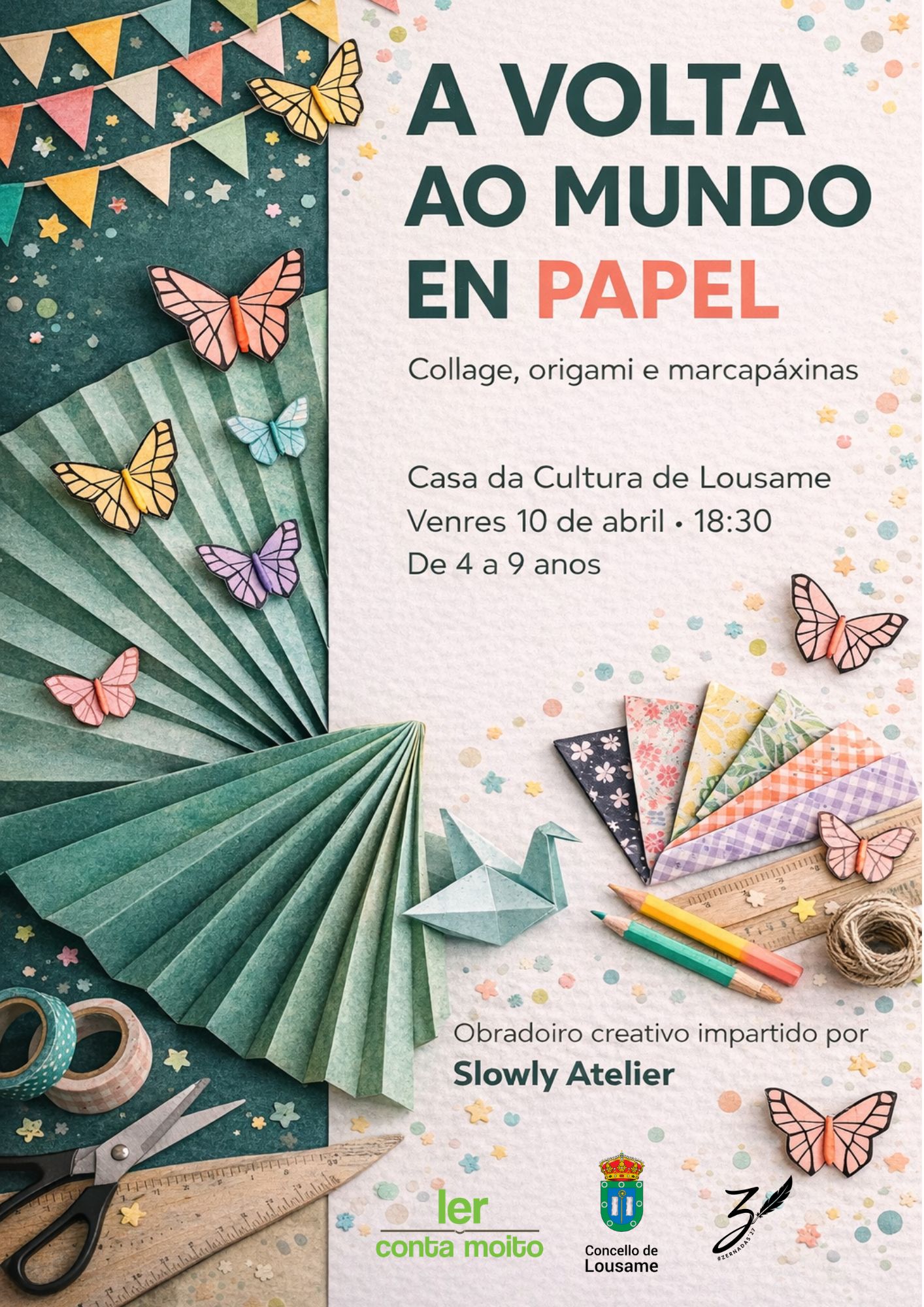 O Concello de Lousame, en colaboración co programa Ler conta moito, organiza o obradoiro cultural “A volta ao mundo en papel: collage, origami e marcapáxinas”. Un taller impartido por Slowly Atelier dirixido a nenos e nenas de entre 4 e 10 anos de idade, que deberán anotarse en bandoticket.com.