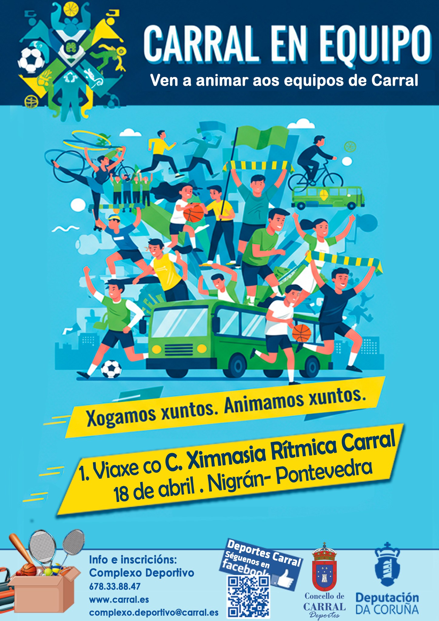 Neste marco, o Concello organizará viaxes gratuítas en autobús, cun número limitado de prazas, para facilitar que veciños e veciñas poidan asistir como público as diferentes citas deportivas. O programa arrinca o próximo 18 de abril en Nigrán (Pontevedra), cun desprazamento para apoiar o Club de Ximnasia Rítmica de Carral nun torneo galego.