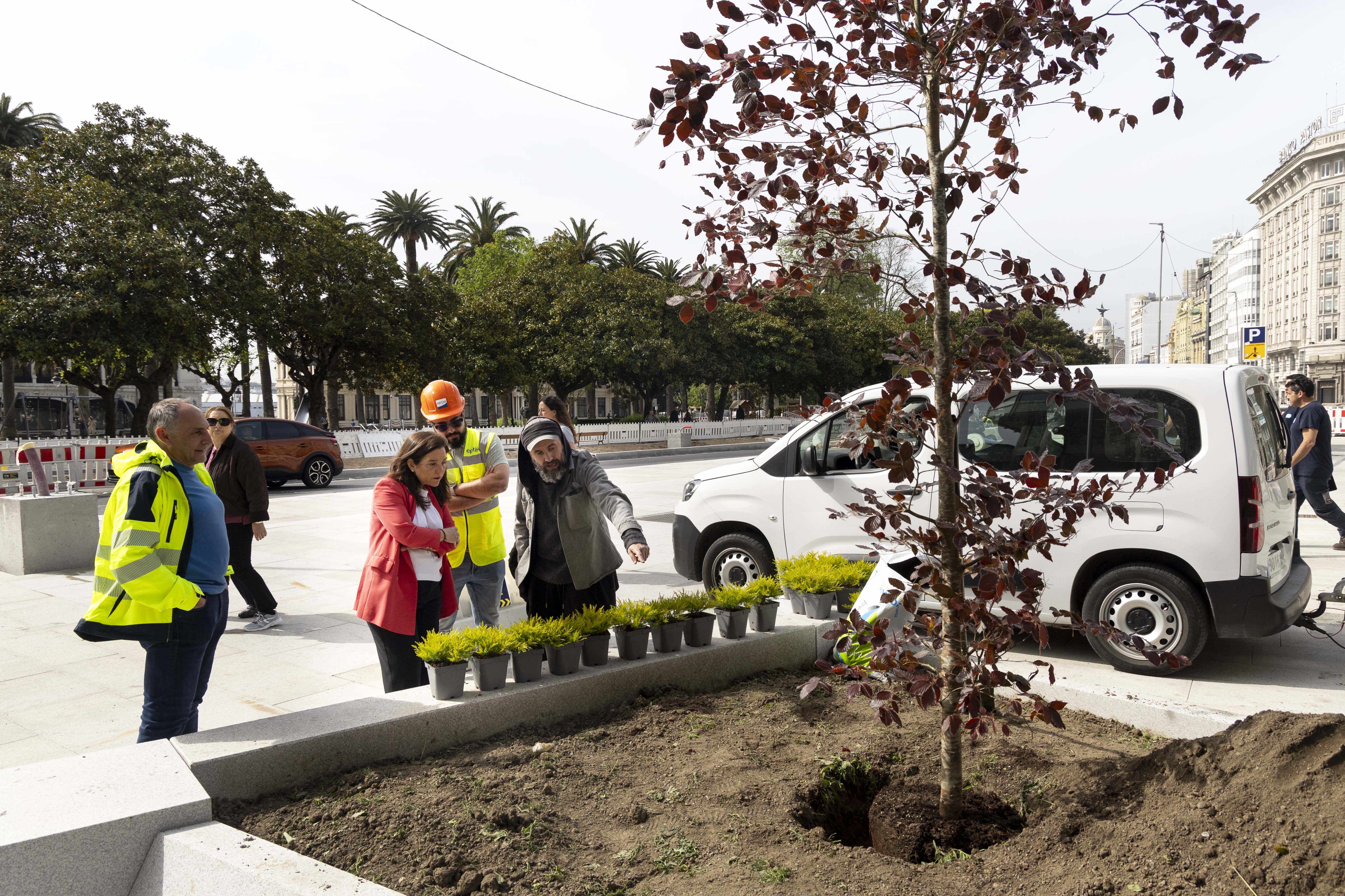 Hoxe plantáronse as catro faias vermellas previstas que, a partir de agora, adornarán a contorna do Obelisco —un punto histórico que ten por primeira vez poboación arbórea nas súas inmediacións—. A ampliación de elementos naturais nos Cantóns forma parte do proxecto de remodelación a grande escala que está a executarse, que recollía a renaturalización do espazo seguindo os criterios aplicados polo Goberno de Inés Rey en todas as obras públicas de urbanización.
